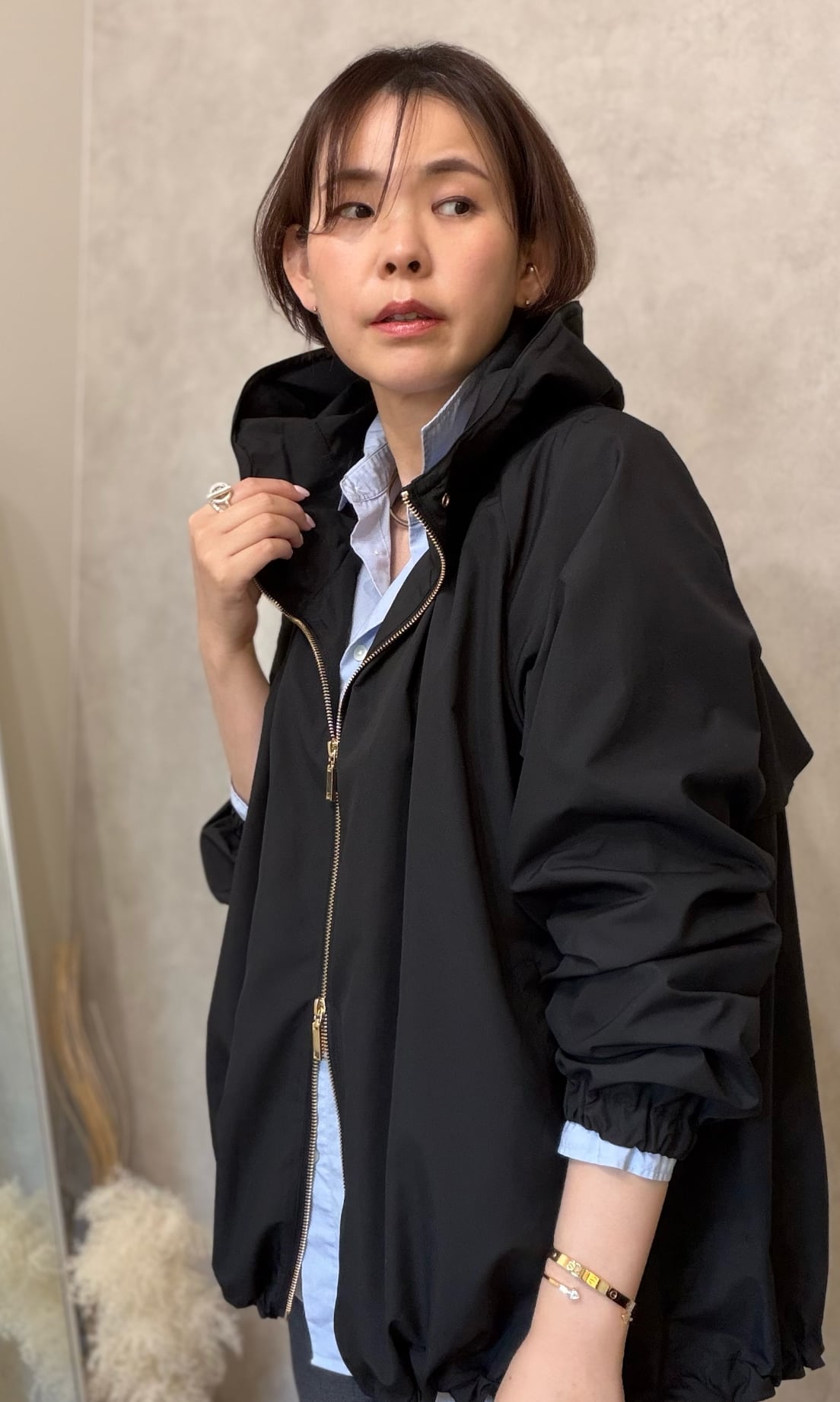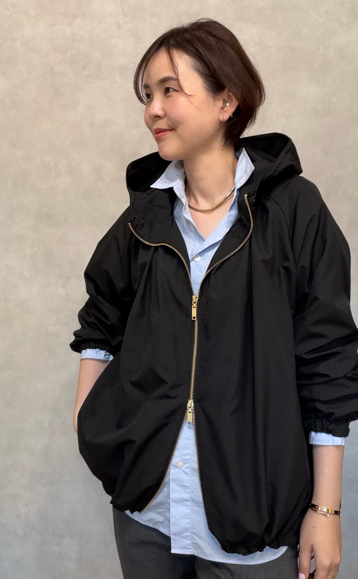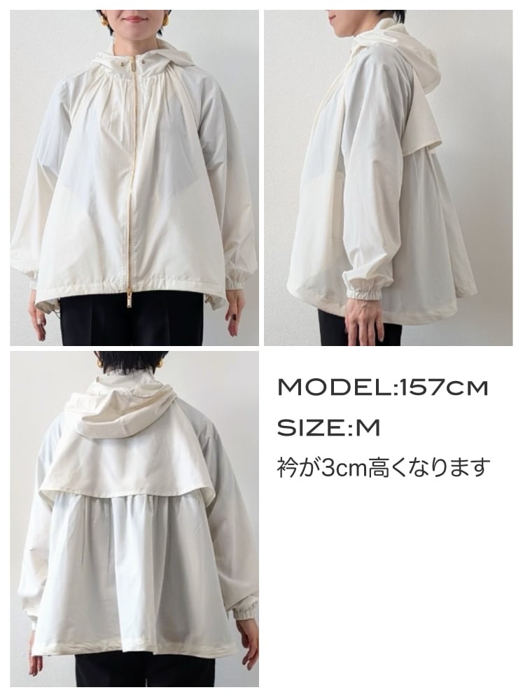 薄くて柔らかい生地ではどうしてもフードが寝てしまいますが、柔らかいワイヤーをいれることによってフードの形を立体的に保つことが可能に。小顔効果も期待できます。